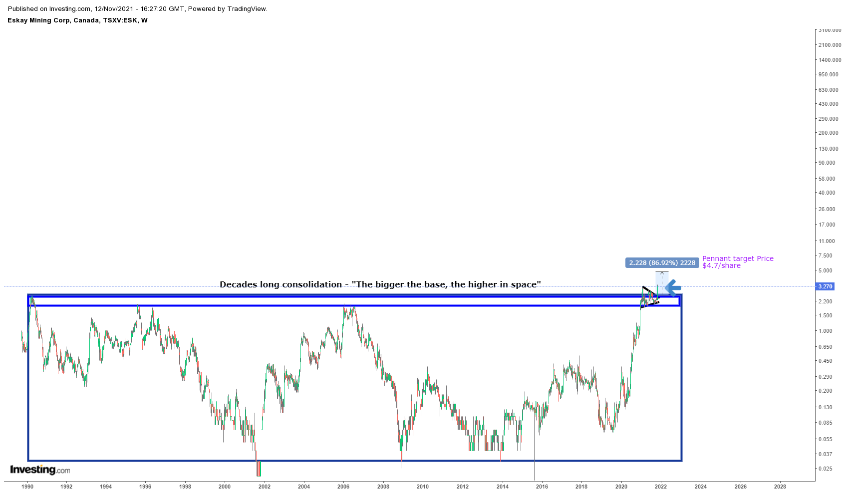 Meaning the longer a stock has consolidated the more energy will be released when it finally breaks out and I have yet to personally see a bigger consolidation pattern than what Eskay Mining is currently starting to break out of…