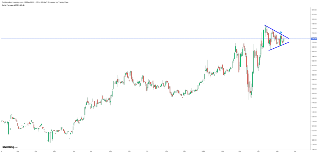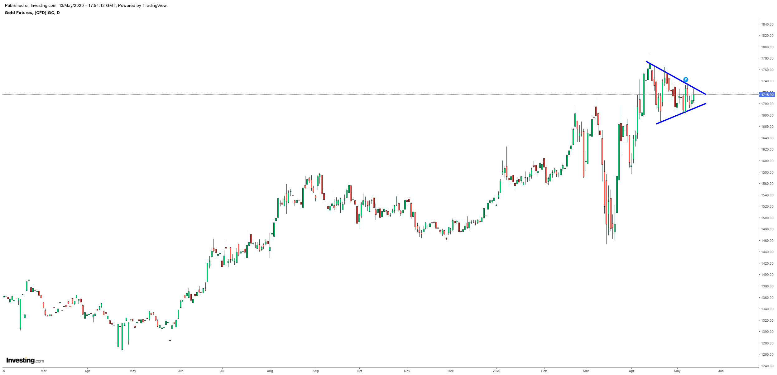 Given that gold looks to be consolidating (getting squeezed) in a pennant right now it shouldn’t be long before we see some real action, up or down:
