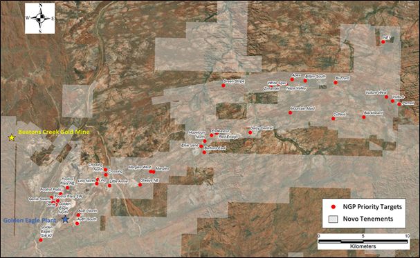 - Novo’s board of directors has approved an additional A$2.5M exploration budget to accelerate drilling of high-priority near-mine targets in the Mosquito Creek Basin which hosts the Nullagine gold project (the “NGP”) and the Golden Eagle processing facility.