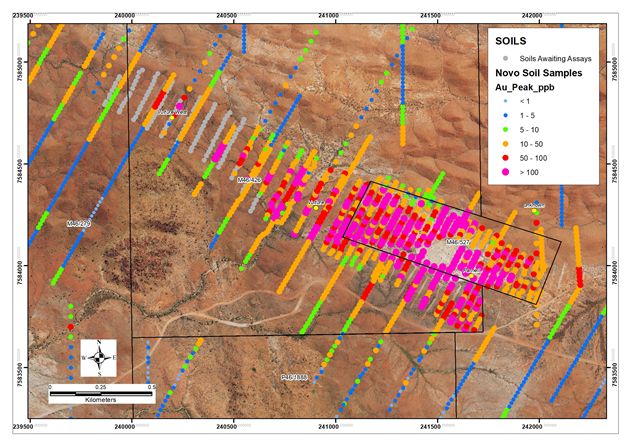 - Novo’s exploration team has recently identified high priority drill targets including the Parnell-Vulture prospect. Significant results have been returned from mapping, rock chip and soil sampling programs, including a very large 1.5 km long, up to 500 m wide zone dominated by soil samples grading 100 ppb Au or better. These results are not necessarily representative of mineralization at the site.