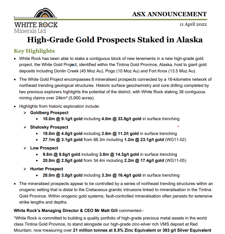 White Rock Minerals (WRM.AX): High-Grade Gold Prospects Staked in AlaskaLINK to news release.Snapshot of news release: April 13, 2022 admin White Rock Minerals No Comment «Novo (NVO.TO): Agrees to Sell Stake in New Found Gold for C$125.9 Million Inflection Resources (AUCU.CN): Outlines Next Series of Alkalic Copper-Gold Porphyry Projects To Be Drill Tested In New South Wales» Subscribe to my Newsletter! Leave a Reply Cancel replyYour email address will not be published. Required fields are marked *Comment *Name *Email *Website Current ye@r * Leave this field empty Δ